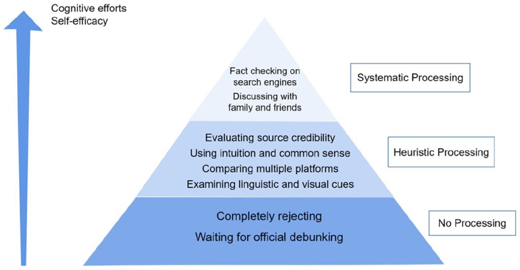 They reported low motivation in verifying the information and often either rejected any information they perceived as suspicious or waited for the government to debunk rumors. Even among those who tried to verify information, most relied exclusively on heuristic processing cues such as source credibility, linguistic and visual cues, and intuition. Systematic processing strategies such as fact-checking and discussing with family and friends were seldom used.