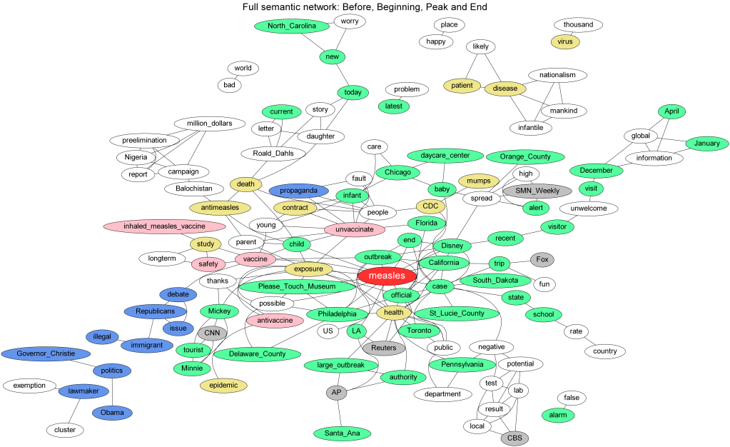 Semantic networks represent the semantic relationships among a set of words. In a semantic network, word-use frequencies and co-occurrence of the most frequently occurring words represent shared meanings and common perceptions. For instance, the cluster of purple words in the lower-left corner of the network represents the political frame, where people talk about the causes and solutions of the outbreak in political terms. For instance, whether measles was brought to the US by immigrant? What kind of role the government should play in preventing such outbreaks?