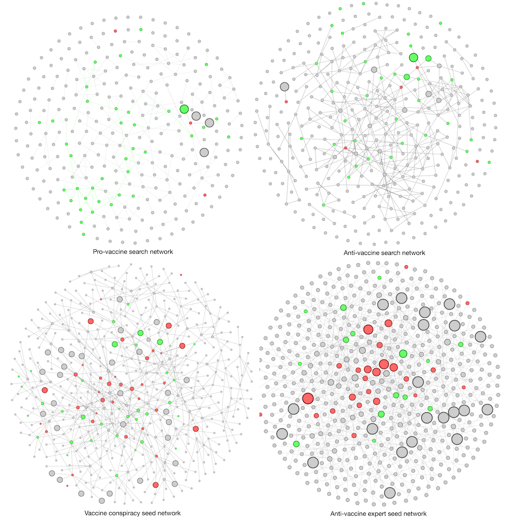 What we found was that viewers are more likely to encounter anti-vaccine videos through direct navigation starting from an anti-vaccine seed video (the two networks on the bottom) than through goal-oriented browsing (the two networks on the top).